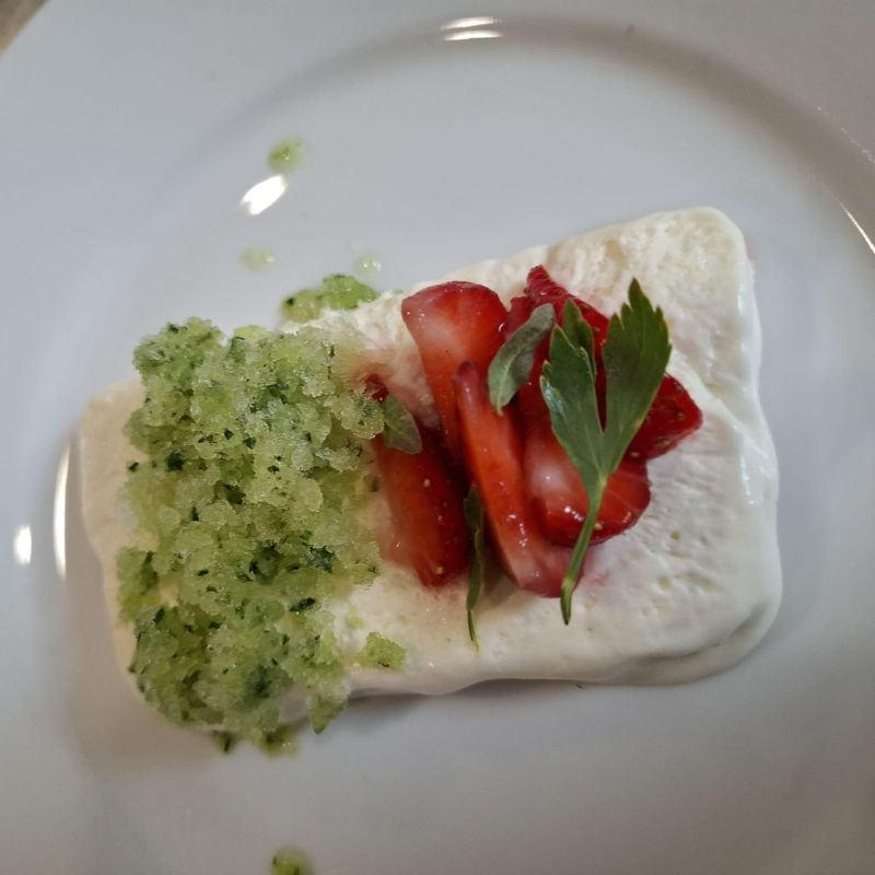 - Elderflower yoghurt parfait with English strawberries and cucumber kombucha granita with lovage and verbena