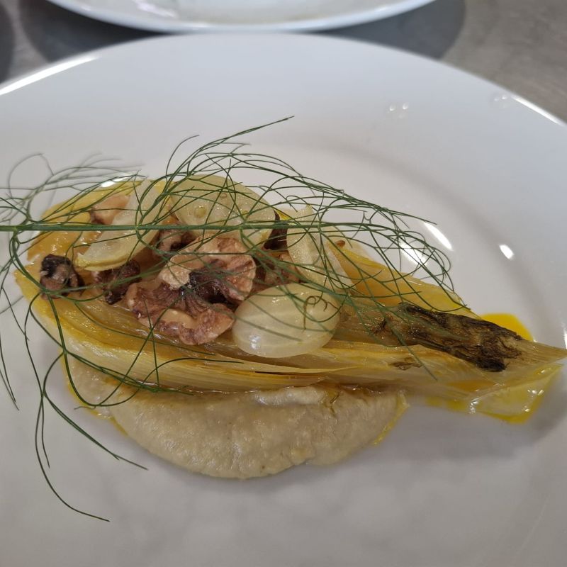 - Braised fennel with fennel cream, fermented gooseberries, roasted walnut, and preserved lemons